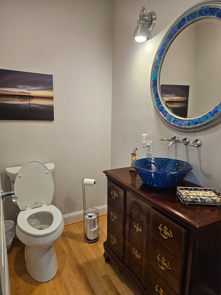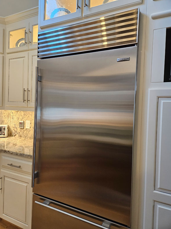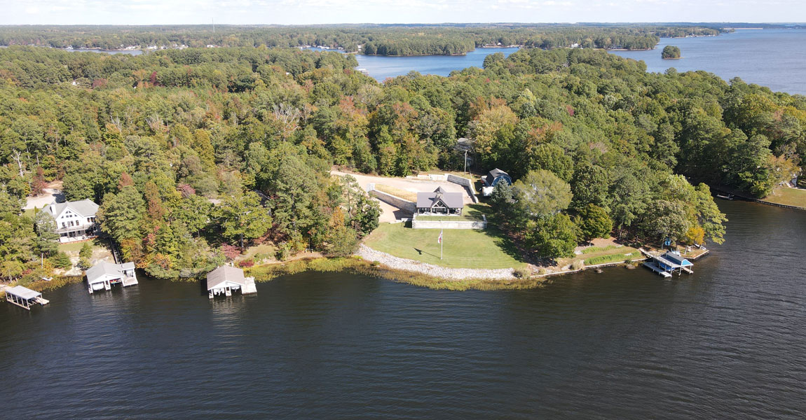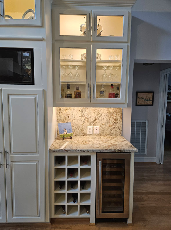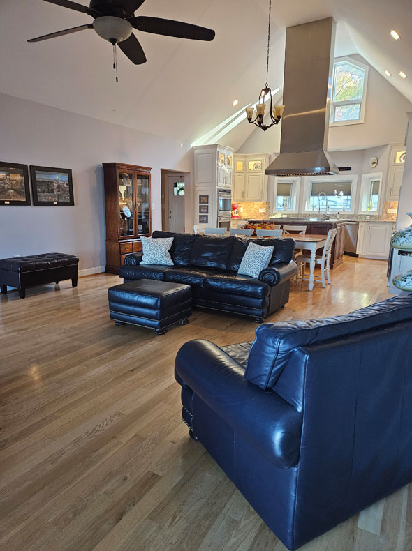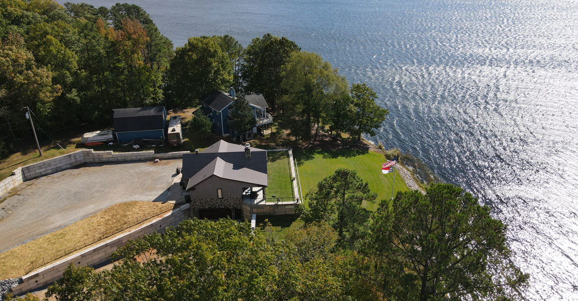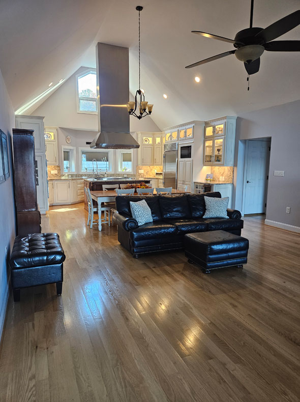 The Lake Gaston home for sale by owner has a Chef’s Kitchen featuring granite counters, a stainless farmhouse sink, a large cherry island, a Stainless “Subzero” refrigerator, and wine cooler, Stainless “Wolf” double ovens, 4 burner cooktops with griddle, a microwave, and exhaust, under the cabinet lighting and lighting in the seed glass upper cabinets (all cabinets are custom built by Quality Cabinets in Roanoke Rapids NC)