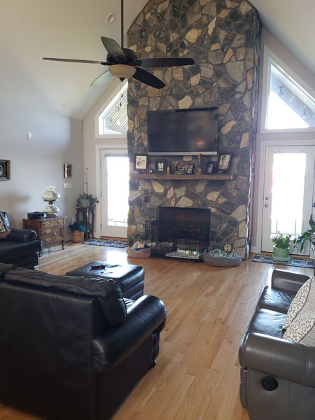 Open concept family room, kitchen, and dining with stone fireplace featuring gas logs and over 100-year-old sinker cypress mantel, cathedral ceiling with Hunter Douglas ceiling fan and can lighting. The half bath has a cherry cabinet with a vessel sink and oak floors.