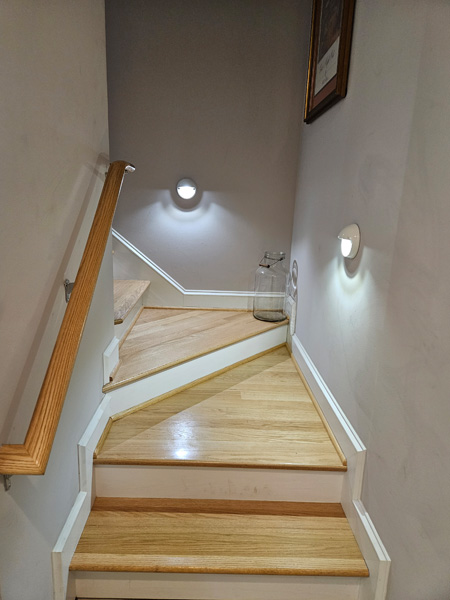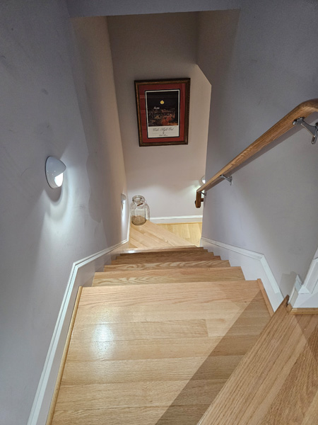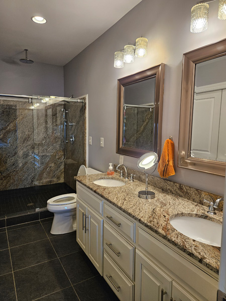 Two Ensuite bedrooms are located on the main floor and feature Hunter Douglas ceiling fans, walk-in granite showers, granite counters with double sinks, custom cabinets, tile floors, and pocket doors to closets. Lighted stairs to the basement have oak stairs and handrail