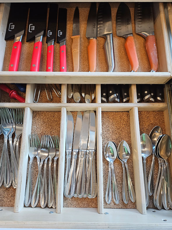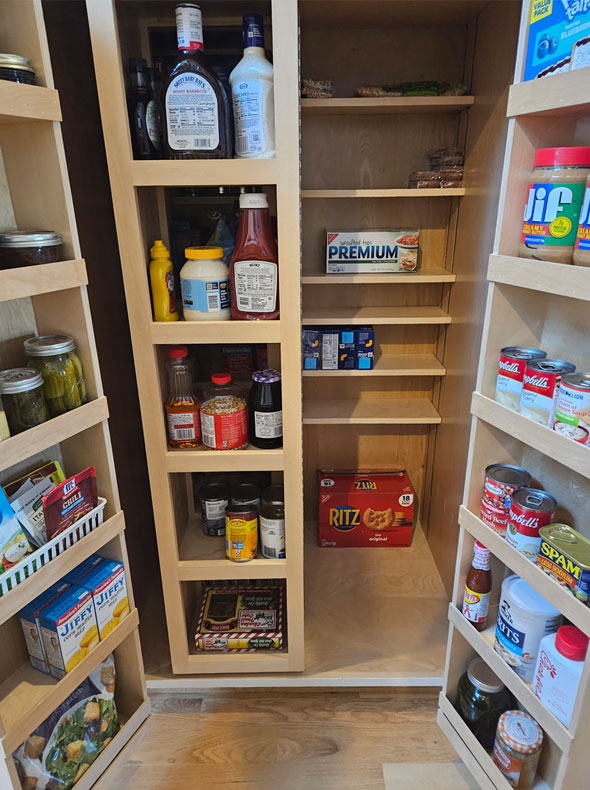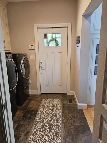 The laundry room has a washer and dryer hookups, custom cabinets, and a built-in ironing board with tile flooring.